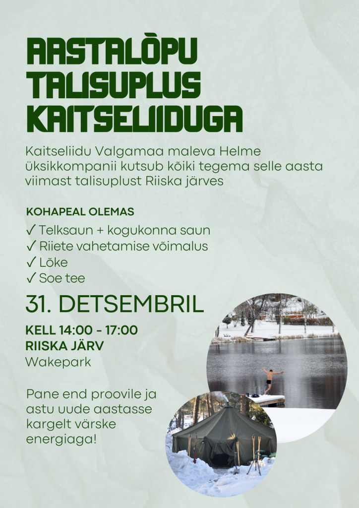 Kaitseliidu Valgamaa maleva Helme üksikkompanii kutsub kõiki tegema selle aasta viimast talisuplust Riiska järves! Tule üksi, sõpradega või perega – teeme koos ühe korraliku värskenduse enne uue aasta algust.