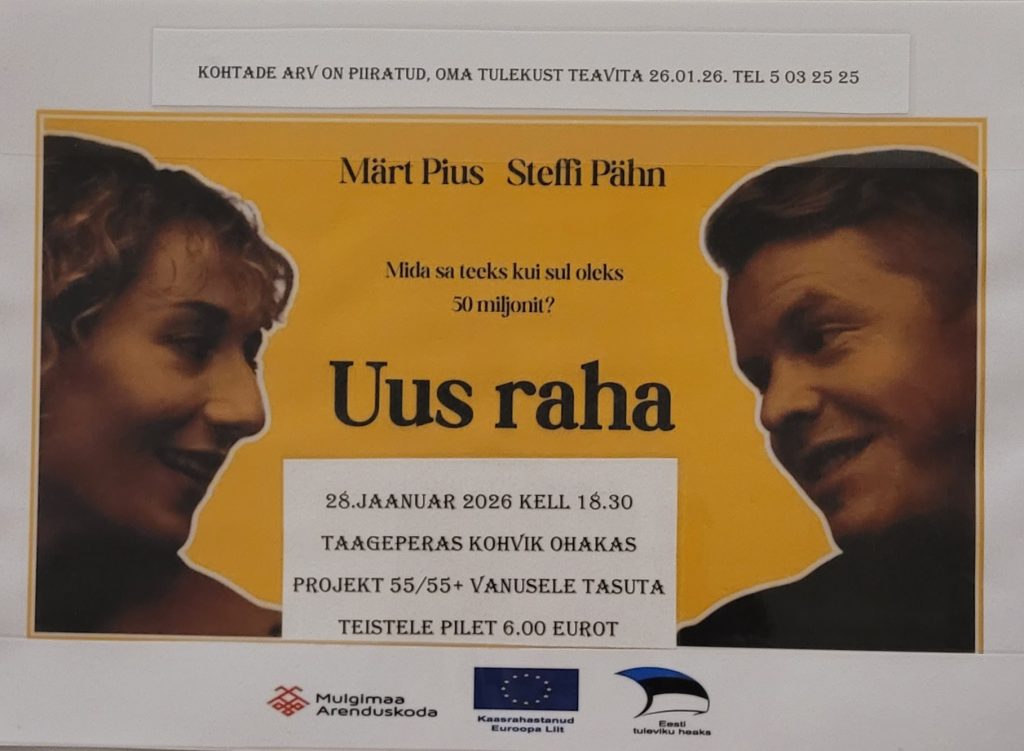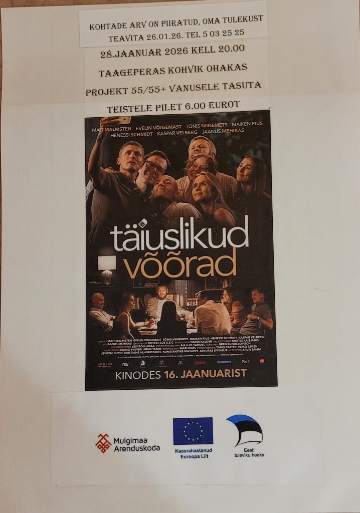28. jaanuaril on Eesti filmide õhtu kohvik Ohaka ruumides. Kell 18.30 alustatakse filmiga “Uus raha” ning 20.00 filmiga “Täislikud võõrad”. Projektis saavad osaleda 55/55+ vanuses inimesed. Tasuta kohtade arv on piiratud. Helista ja registreeri Pille Valneri telefonil 503 2525. Teistele pilet 6 eurot.