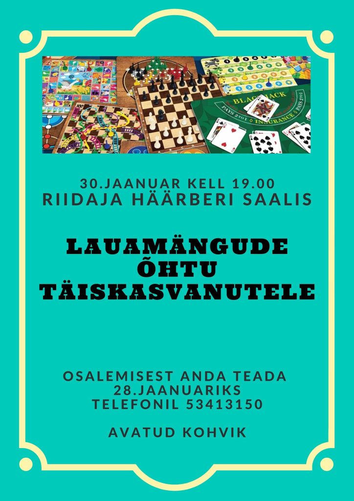 30. jaanuaril kell 19.00 olete oodatud Riidaja häärberi saali lauamängude õhtule.